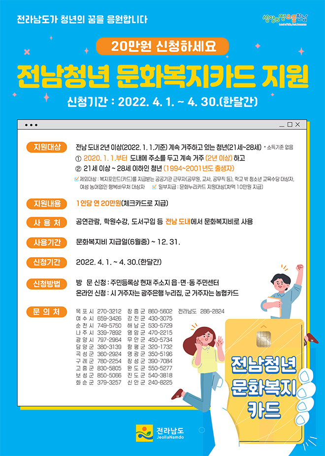 ¿ÃÇØ óÀ½ ½ÃÇàµÇ´Â Àü³²Ã»³â ¹®Èº¹ÁöÄ«µå Áö¿ø»ç¾÷Àº °ø¿¬ °ü¶÷, Çпø ¼ö°, µµ¼ ±¸ÀÔ µî¿¡ »ç¿ëÇÒ ¼ö ÀÖ´Â ¹®Èº¹Áöºñ¸¦ 1ÀÎ´ç ¿¬°£ 20¸¸¿ø üũīµå·Î Áö¿øÇÏ´Â »ç¾÷ÀÌ´Ù.