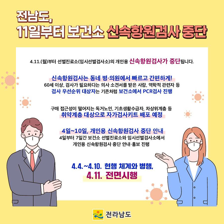 Àü³²µµ´Â µµ¹ÎÀÇ È¥¶õÀ» ¹æÁöÇϱâ À§ÇØ 4ÀϺÎÅÍ 7Àϰ£ º¸°Ç¼Ò ¼±º°Áø·á¼Ò¿Í Àӽü±º°°Ë»ç¼Ò¿¡¼ °³ÀÎ¿ë ½Å¼ÓÇ׿ø°Ë»ç Áß´ÜÀ» ¾È³»¡¤È«º¸ÇÑ´Ù.