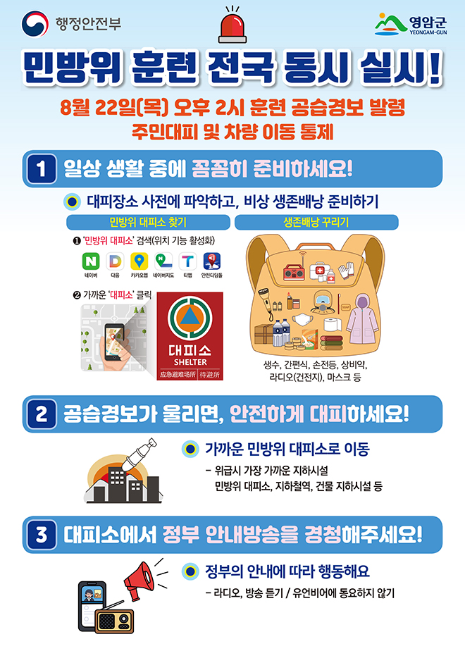 ¿µ¾Ï±ºÀÌ 8¿ù 22ÀÏ ¿ÀÈÄ 2½ÃºÎÅÍ À»Áö¿¬½À ±â°£¿¡ ¸ÂÃç ¹Î¹æÀ§ÈÆ·ÃÀ» ½Ç½ÃÇÑ´Ù°í ¹àÇû´Ù. À̹ø ÈÆ·ÃÀº ¿µ¾Ï°æÂû¼, ¿µ¾Ï¼Ò¹æ¼, À°±º Á¦8539ºÎ´ë 3´ë´ë¿Í ÇÔ²² ÁøÇàµÇ¸ç, Àü±¹¿¡¼ µ¿½Ã¿¡ ÀÌ·ïÁø´Ù.
