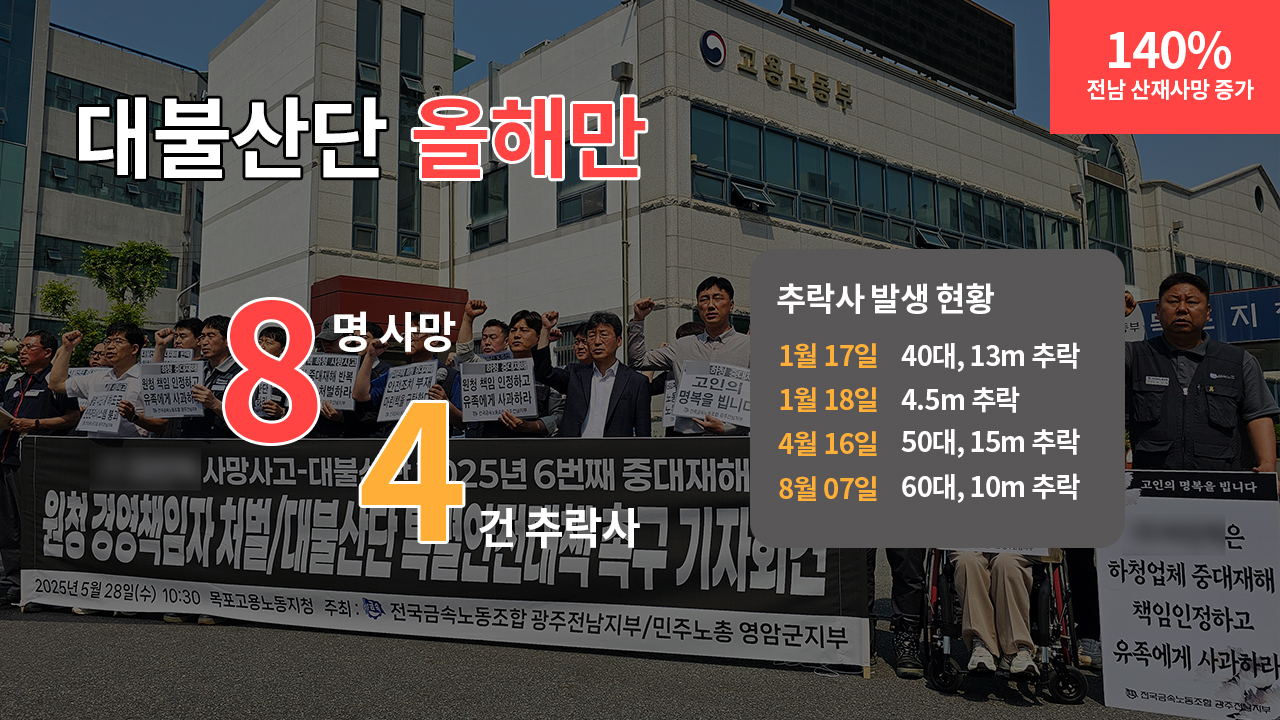 4¿ù 16ÀÏ¿¡´Â ž籤 ÆÐ³ÎÀ» º¸¼öÇÏ´ø 50´ë ³ëµ¿ÀÚ°¡ 15¹ÌÅÍ ³ôÀÌ¿¡¼ Ãß¶ôÇØ ¸ñ¼ûÀ» ÀÒ¾ú´Ù. ³× Â÷·Ê Ãß¶ô»ç¸¦ Æ÷ÇÔÇØ ¿ÃÇØ ´ëºÒ»ê´Ü¿¡¼ ¹ß»ýÇÑ »ê¾÷ÀçÇØ »ç¸ÁÀÚ´Â ¸ðµÎ 8¸í¿¡ ´ÞÇÑ´Ù. ³¢ÀÓ, ÈÀç, ±ò¸² µî ´Ù¾çÇÑ À¯ÇüÀÇ »ç°í°¡ ÇÑ ´Þ¿¡ ÇѵΠ¹ø²Ã·Î ¹ß»ýÇϰí ÀÖ´Ù.