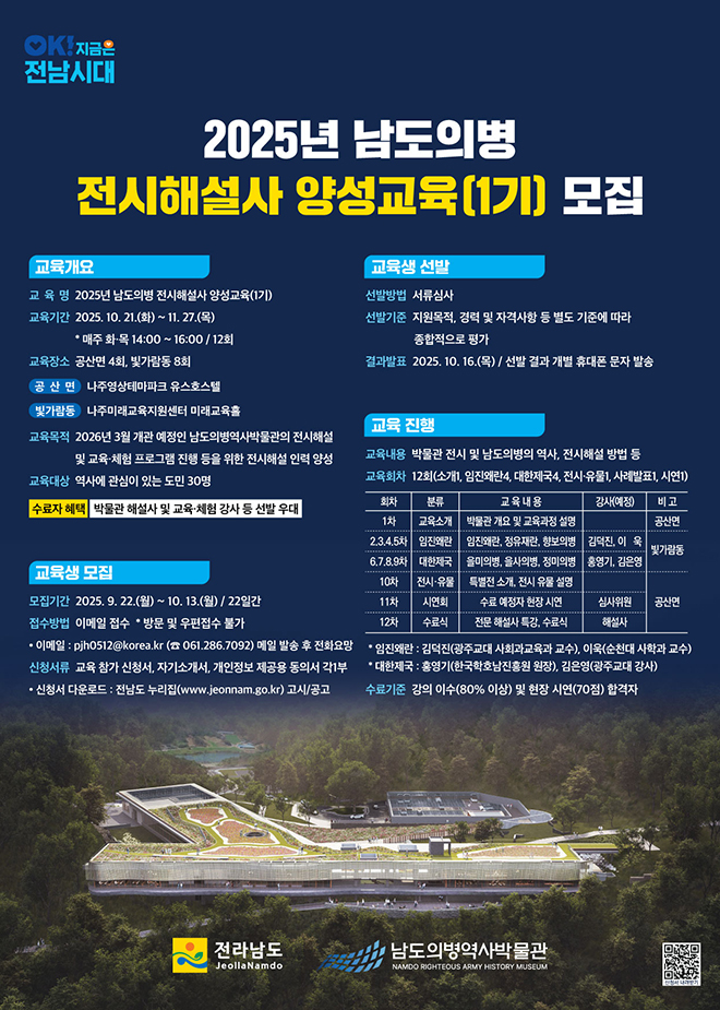 Àü¶ó³²µµ°¡ ³»³â 3¿ù °³°ü ¿¹Á¤ÀÎ ³²µµÀǺ´¿ª»ç¹Ú¹°°ü¿¡¼ Ȱµ¿ÇÒ Àü½ÃÇØ¼³»ç¿Í ±³À°Ã¼Çè °»ç ±³À°»ý 30¸íÀ» 10¿ù 13ÀϱîÁö ¸ðÁýÇÑ´Ù.