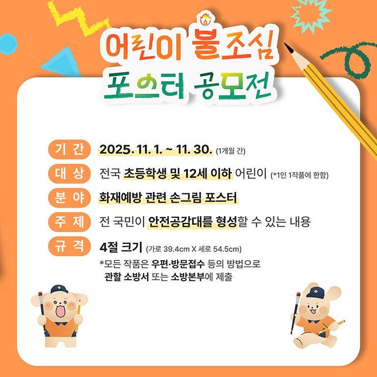 °ø¸ð ´ë»óÀº Àü±¹ ÃʵîÇлý ¹× 12¼¼ ÀÌÇÏ ¾î¸°ÀÌ´Ù. Âü°¡ÀÚ´Â ÈÀ翹¹æ°ú ¾ÈÀü¹®È¸¦ ÁÖÁ¦·Î ÇÑ ¼Õ±×¸² Æ÷½ºÅ͸¦ 4Àý Å©±â(°¡·Î 39.4cm, ¼¼·Î 54.5cm)·Î ÀÛ¼ºÇØ Á¦ÃâÇÏ¸é µÈ´Ù.