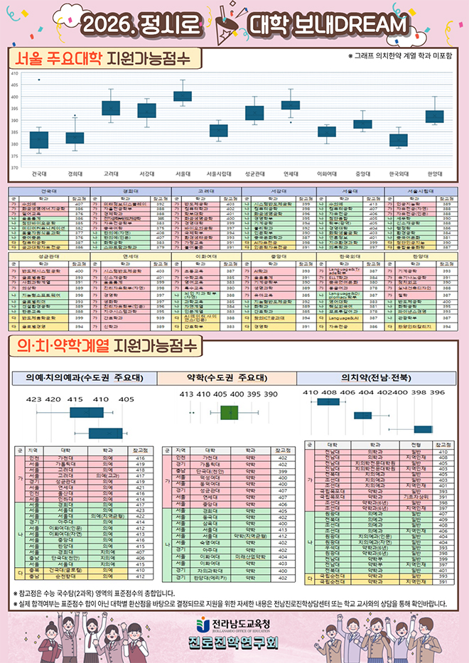 µµ±³À°Ã» Áø·ÎÁøÇבּ¸È¸ ¹èġǥ °³¹ßÆÀÀº 2026Çг⵵ ¼ö´É ½ÇäÁ¡ °á°ú¸¦ ºÐ¼®ÇØ ¡®Ç¥ÁØÁ¡¼ö Á¤½Ã·Î ´ëÇÐ º¸³»DREAM¡¯ ÀڷḦ Á¦ÀÛÇß´Ù. ÀÌ ¹èġǥ¿¡´Â ¼öµµ±Ç¡¤Àü¶ó±Ç ÀÇ¡¤Ä¡¡¤¾àÇа述ú ¼¿ï ÁÖ¿ä ´ëÇÐ, Àü³²´ëÇб³ÀÇ °è¿º° Áö¿ø °¡´É ¿¹»ó Á¡¼ö°¡ ´ã°å´Ù.