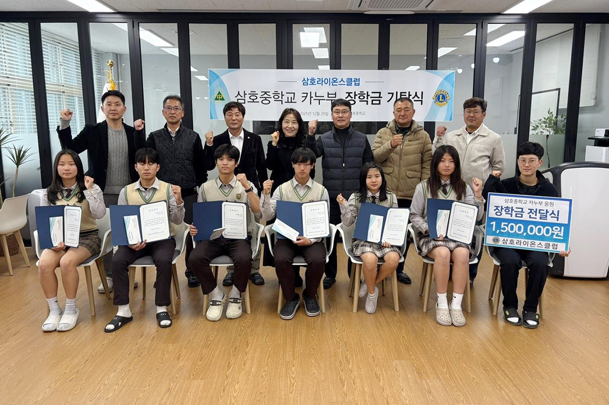 »ïÈ£ ¶óÀ̿½ºÅ¬·´ÀÌ »ïÈ£ÁßÇб³ Ä«´©ºÎ Çлý¼±¼öµé¿¡°Ô ÀåÇбÝÀ» Àü´ÞÇß´Ù.