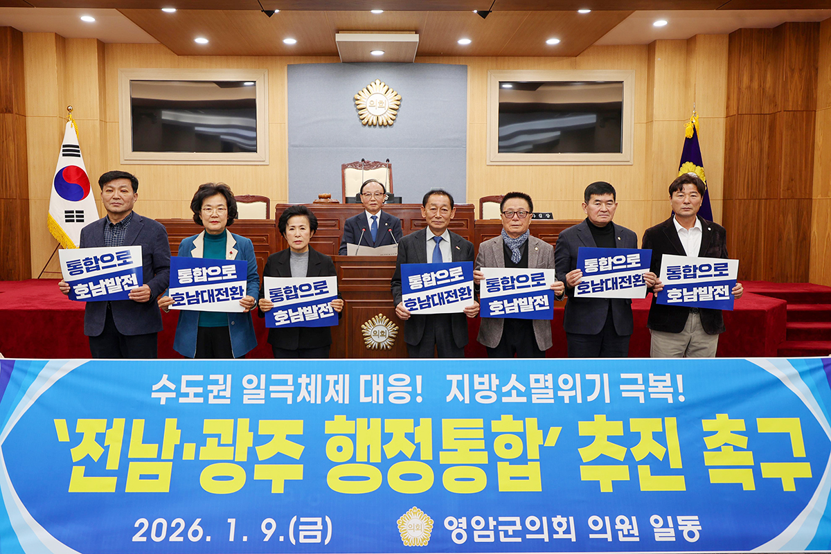 ¿µ¾Ï±ºÀÇȸ(ÀÇÀå ¹ÚÁ¾´ë)´Â Áö³ 9ÀÏ º»È¸ÀÇÀå¿¡¼ ÀÇ¿ø Àϵ¿ ¸íÀÇ·Î ¡®Àü¶ó³²µµ-±¤ÁÖ±¤¿ª½Ã ÇàÁ¤ÅëÇÕ ÃßÁø Ã˱¸ ¼º¸í¡¯À» ¹ßÇ¥Çß´Ù. ±è¿µ·Ï Àü³²µµÁö»ç¿Í °±âÁ¤ ±¤ÁÖ½ÃÀåÀÌ Áö³ 2ÀÏ ÅëÇÕÀ» °ø½Ä ¼±¾ðÇÑ µ¥ ´ëÇØ ±âÃÊÀÇȸ Â÷¿ø¿¡¼ ÀÔÀåÀ» ¹àÈù °ÍÀÌ´Ù.