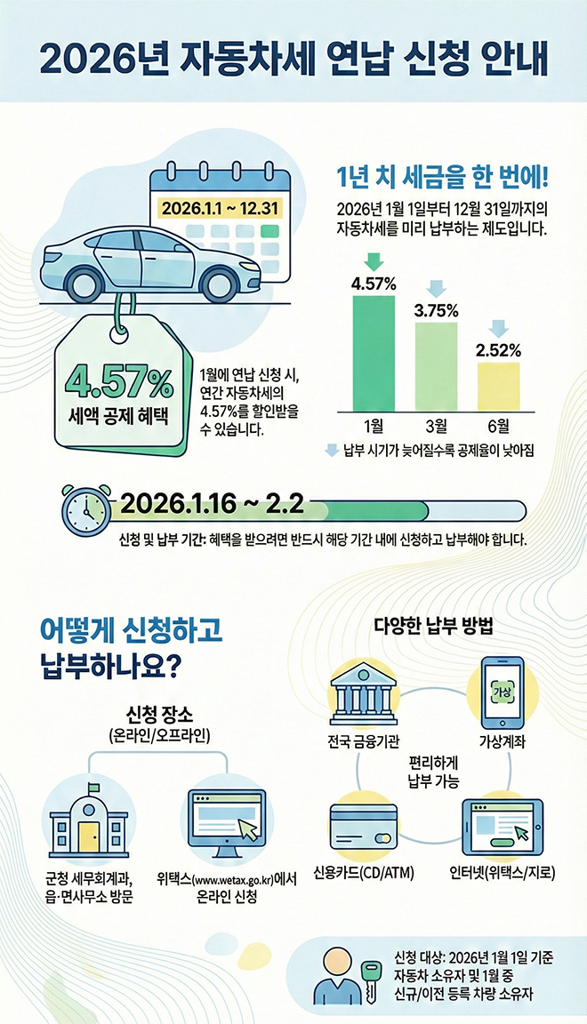 ¿µ¾Ï±ºÀÌ ÀÚµ¿Â÷¼¼ ¿¬³³ ½ÅûÀ» ´ÙÀ½ ´Þ 2ÀϱîÁö ¹Þ´Â´Ù. ¿¬³³Àº 6¿ù°ú 12¿ù¿¡ ³ª´² ³»´Â ÀÚµ¿Â÷¼¼¸¦ 1¿ù¿¡ ¹Ì¸® ³³ºÎÇÏ´Â Á¦µµ´Ù. 1¿ù¿¡ ³»¸é ¿¬¼¼¾×ÀÇ 4.57%¸¦ °øÁ¦¹Þ´Â´Ù.