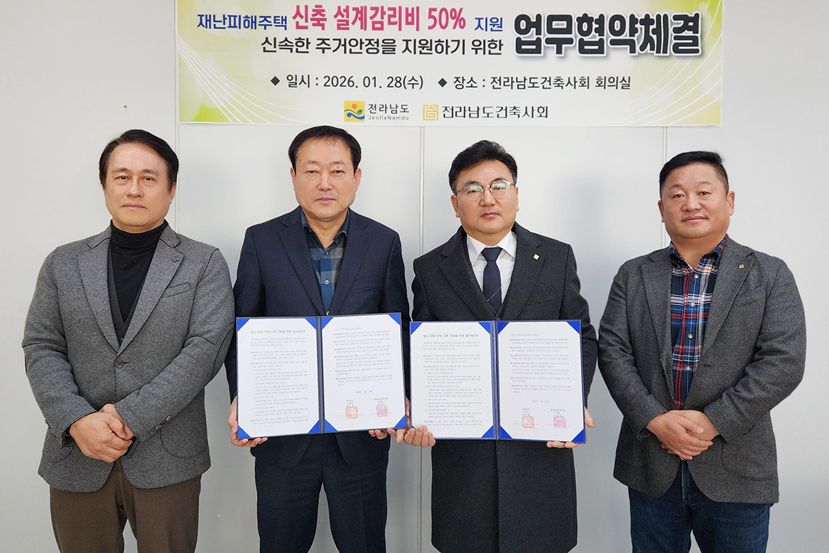 Àü¶ó³²µµ°¡ ÀÚ¿¬Àç³À¸·Î ÁýÀÌ ¹«³ÊÁö°Å³ª Å©°Ô ºÎ¼Áø °¡±¸ÀÇ ÁÖÅà Àç°Ç ºñ¿ë ºÎ´ãÀ» ÁÙÀ̱â À§ÇØ ´ëÇѰÇÃà»çÇùȸ Àü³²µµ°ÇÃà»çȸ¿Í ¾÷¹«Çù¾àÀ» ü°áÇß´Ù.