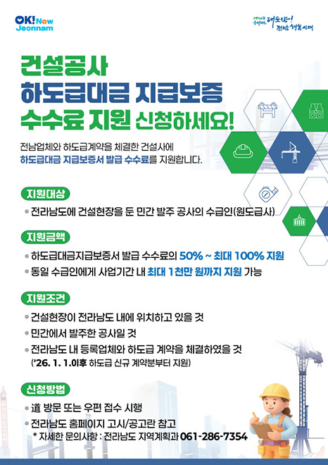 Àü³²µµ´Â Áö³ 1ÀÏ ¡®2026³â °Ç¼³°ø»ç Çϵµ±Þ´ë±Ý Áö±Þº¸Áõ ¼ö¼ö·á Áö¿ø»ç¾÷¡¯À» È®´ë ½ÃÇàÇÑ´Ù°í ¹àÇû´Ù. ÀÌ »ç¾÷Àº Áö¿ª ¾÷ü¿Í ½Å±Ô Çϵµ±Þ °è¾àÀ» ¸ÎÀº ¿øµµ±Þ»ç¸¦ ´ë»óÀ¸·Î º¸Áõ¼ ¹ß±Þ ¼ö¼ö·á¸¦ Áö¿øÇÏ´Â Á¦µµ·Î, 2025³â óÀ½ ½ÃÇàµÆ´Ù. ±âÁ¸ °è¾à¿¡´Â Àû¿ëµÇÁö ¾Ê´Â´Ù.