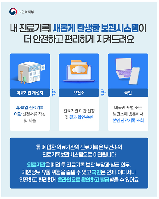 Áø·á±â·Ïº¸°ü½Ã½ºÅÛÀº ÈÞ¡¤Æó¾÷ÇÑ º´¡¤ÀÇ¿øÀÇ Áø·á±â·ÏÀ» ¿Â¶óÀÎÀ¸·Î ¿¶÷Çϰųª »çº»À» ¹ß±Þ¹ÞÀ» ¼ö ÀÖµµ·Ï Áö¿øÇÏ´Â ¼ºñ½º·Î, Áö³ÇØ 7¿ù 21ÀϺÎÅÍ ½ÃÇàµÆ´Ù.