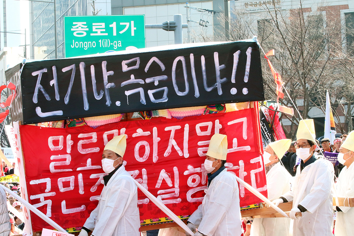 Âü°¡ÀÚµéÀº 4ÀÏ ±È±â´ëȸ ÈÄ ±¤È¹®¿¡¼ û¿Í´ë ÀαٱîÁö 2km¸¦ ÇàÁøÇϸç, ¿ëÀÎ ¹ÝµµÃ¼ ±¹°¡»ê´Ü Àü¸é Àç°ËÅä, »çȸÀû ´ëȱⱸ ±¸¼º, ¿¡³ÊÁö ºÐ»ê Á¤Ã¥ ¸¶·Ã, Àü·Â ºÒÆòµî ÇØ¼Ò¸¦ À§ÇÑ Á¦µµ °³Æí µî 4´ë ¿ä±¸¾ÈÀ» ´ëÅë·É½Ç¿¡ Àü´ÞÇß´Ù. Àü±¹ÇൿÀº ÇöÀç 1¸¸ 1,000¿© ¸íÀÌ Âü¿©ÇÑ ¼¸í¿îµ¿À» 10¸¸ ¸í±îÁö È®´ëÇÒ °èȹÀÌ´Ù.