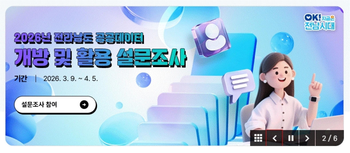Àü³²µµ´Â ¿À´Â 4¿ù 5ÀϱîÁö 4ÁÖ°£ ¡®°ø°øµ¥ÀÌÅÍ °³¹æ ¹× Ȱ¿ëÀ» À§ÇÑ ´ë±¹¹Î ¼³¹®Á¶»ç¡¯¸¦ ÁøÇàÇÑ´Ù°í 10ÀÏ ¹àÇû´Ù. °ø°øµ¥ÀÌÅÍ¿¡ °ü½É ÀÖ´Â ±¹¹ÎÀ̶ó¸é ´©±¸³ª Àü³²µµ ´©¸®Áý(jeonnam.go.kr) °Ô½ÃÆÇ¿¡¼ ¿Â¶óÀÎÀ¸·Î Âü¿©ÇÒ ¼ö ÀÖ´Ù.