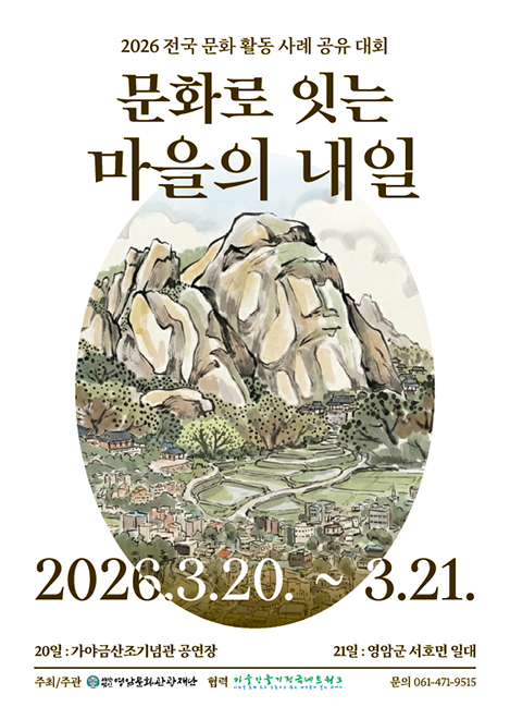 (Àç)¿µ¾Ï¹®È°ü±¤Àç´ÜÀÌ ¿À´Â 20ÀϺÎÅÍ 21ÀϱîÁö ÀÌÆ²°£ ¿µ¾Ï °¡¾ß±Ý»êÁ¶±â³ä°ü °ø¿¬Àå¿¡¼ ¡®2026 Àü±¹ ¹®È Ȱµ¿ »ç·Ê °øÀ¯ ´ëȸ¡¯¸¦ °³ÃÖÇÑ´Ù.