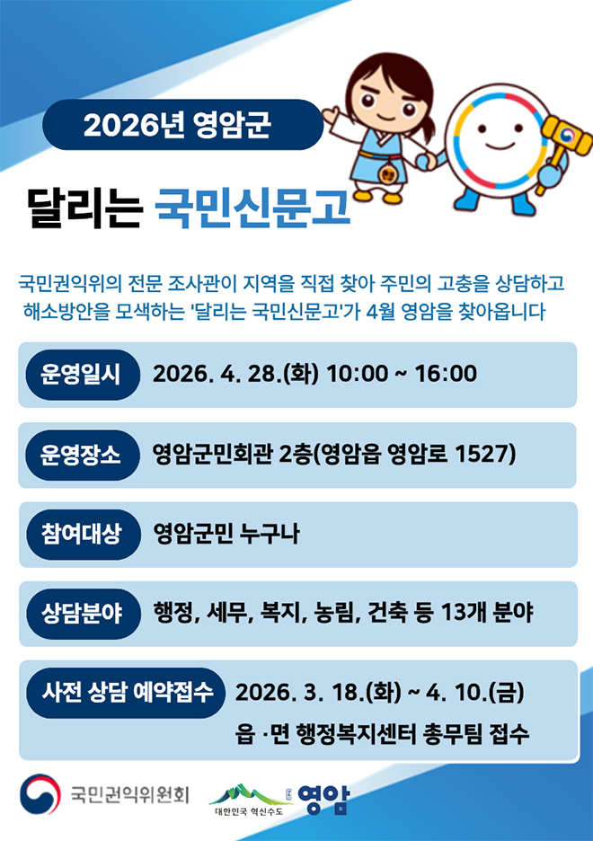 ¡®´Þ¸®´Â ±¹¹Î½Å¹®°í¡¯´Â ±¹¹Î±ÇÀÍÀ§¿øÈ¸°¡ Àü±¹ ±âÃÊÀÚÄ¡´Üü¸¦ ¼øÈ¸ÇÏ¸ç ¿î¿µÇÏ´Â ÇöÀå ¹Î¿ø »ó´ã ÇÁ·Î±×·¥ÀÌ´Ù. ±ÇÀÍÀ§ ¼Ò¼Ó Àü¹® Á¶»ç°üÀÌ Á÷Á¢ Áö¿ªÀ» ¹æ¹®ÇØ ÇàÁ¤¡¤º¹Áö´Â ¹°·Ð »ýȰ¹ý·ü, ¼¹Î±ÝÀ¶, ¼ÒºñÀÚ ÇÇÇØ±¸Á¦ µî ´Ù¾çÇÑ ºÐ¾ßÀÇ ¹Î¿øÀ» »ó´ãÇÑ´Ù.