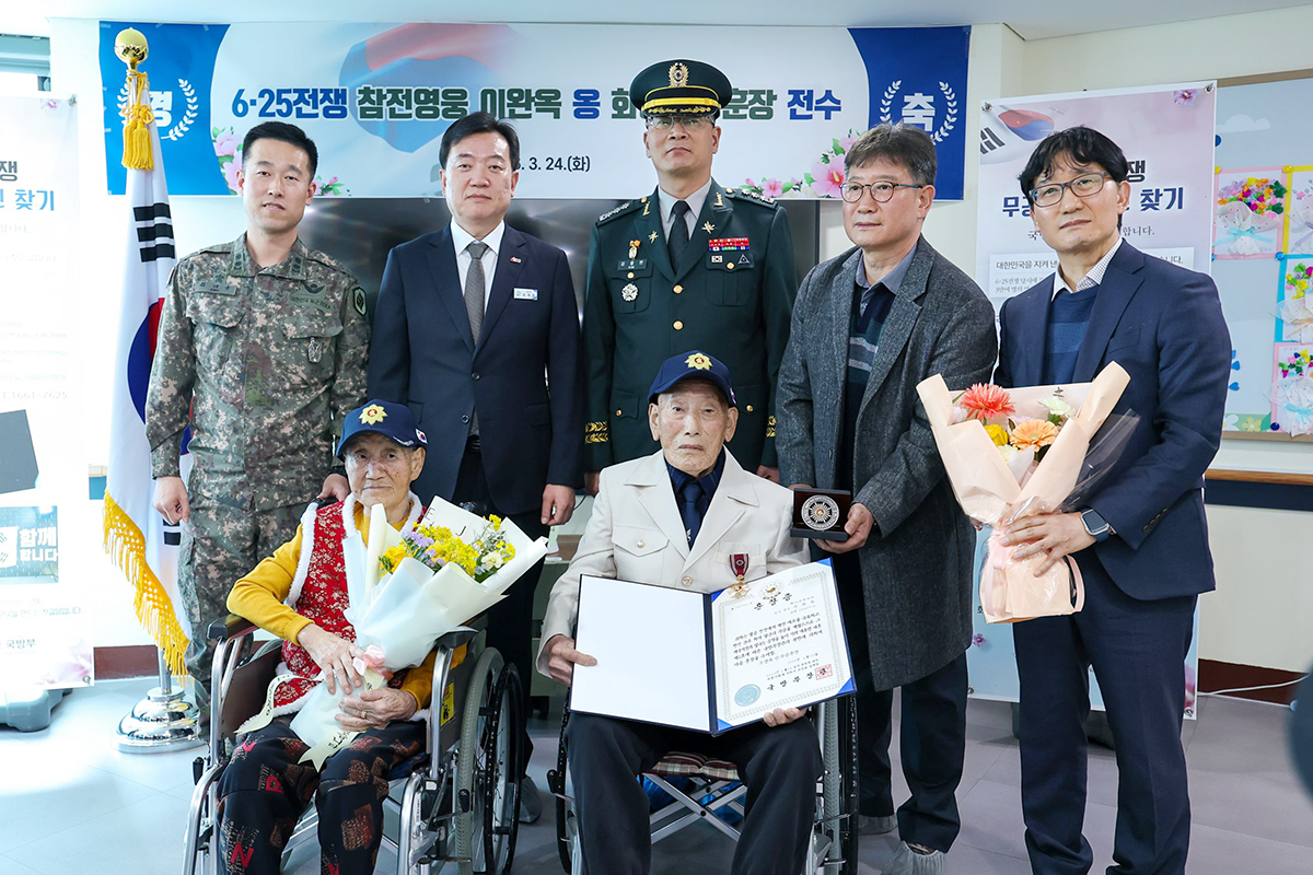 6¡¤25ÀüÀï¿¡ ÂüÀüÇÑ À̿ϿÁ(96) ¾î¸£½ÅÀÌ ¹«°øÈÆÀåÀ» ¹Þ¾Ò´Ù.
