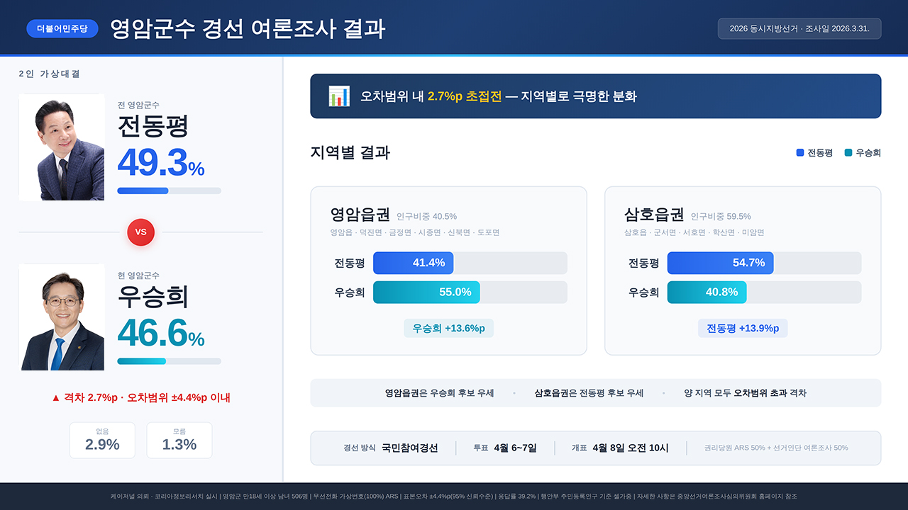 º»Áö°¡ È®ÀÎÇÑ °á°ú Áý°èÇ¥¿¡ µû¸£¸é Áö¿ªº° ºÐȰ¡ °¡Àå ¼±¸íÇÏ´Ù. Áö¿ª1(¿µ¾ÏÀ¾¡¤´öÁø¸é¡¤±ÝÁ¤¸é¡¤½ÃÁ¾¸é¡¤½ÅºÏ¸é¡¤µµÆ÷¸é)¿¡¼´Â ¿ì½ÂÈñ 55.0%, Àüµ¿Æò 41.4%·Î ¿ì½ÂÈñ°¡ 13.6%p ¾Õ¼¹´Ù. Áö¿ª2(»ïÈ£À¾¡¤±º¼¸é¡¤¼È£¸é¡¤Çлê¸é¡¤¹Ì¾Ï¸é)¿¡¼´Â Àüµ¿Æò 54.7%, ¿ì½ÂÈñ 40.8%·Î Àüµ¿ÆòÀÌ 13.9%p ¾Õ¼¹´Ù. ¾ç Áö¿ª ¸ðµÎ ¿ÀÂ÷¹üÀ§¸¦ ³Ñ´Â °ÝÂ÷´Ù. Àα¸ ºñÁßÀº °¡Áß°ª ±âÁØ Áö¿ª2°¡ 59.5%, Áö¿ª1ÀÌ 40.5%´Ù.