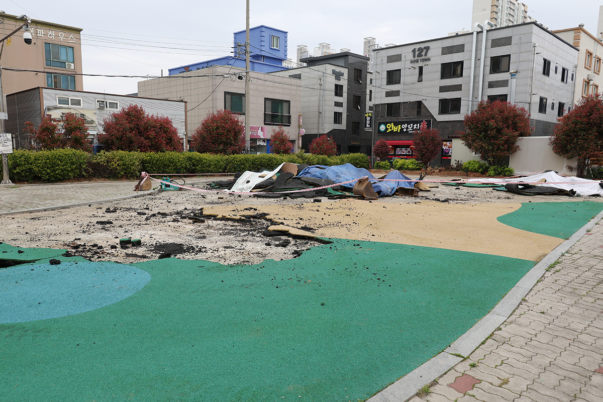 Çö¼ö¸· ¾Æ·¡·Î ÆîÃÄÁø ±¤°æÀº ´ÜÃâÇß´Ù. ³ì»ö ¹Ù´ÚÀç°¡ Âõ°Ü µé¸° °ø¿ø ÀÚ¸®¿¡´Â °ËÀº ¹æ¼öÆ÷¿Í ö°Å ÀÚÀç°¡ ¼öºÏÇß°í, ÁÖȲ»ö ¾ÈÀüÄܰú ºÓÀº ÅëÁ¦ Å×ÀÌÇÁ°¡ ÇöÀå Àüü¸¦ ¿¡¿ö½Î°í ÀÖ¾ú´Ù. Àκεµ, ÀÚÀ縦 ¿Å±â´Â Æ®·°µµ ¾ø¾ú´Ù. ÇÑÂÊ ¸ðÅüÀÌ¿¡´Â ¶â¾î³½ Æ÷ÀåÀç¿Í ºñ´Ò ¾²·¹±â°¡ ½×¿© ÀÖ¾ú´Ù.