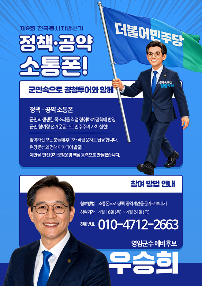 ¿ì ¿¹ºñÈĺ¸ ÃøÀº 16ÀϺÎÅÍ 24ÀϱîÁö 9Àϰ£ ¡®Á¤Ã¥¡¤°ø¾à ¼ÒÅëÆù¡¯À» ¿î¿µÇÑ´Ù°í ¹àÇû´Ù. ¿µ¾Ï±º¹Î ´©±¸³ª ÈÞ´ëÆù 010-4712-2663À¸·Î °ÇÀÇ»çÇ×°ú Áö¿ª Çö¾È, °³¼± ÀÇ°ß µî ¿µ¾Ï ¹ßÀü Á¤Ã¥°ú °ø¾àÀ» ¹®ÀÚ·Î º¸³»¸é Á¢¼öµÈ´Ù.