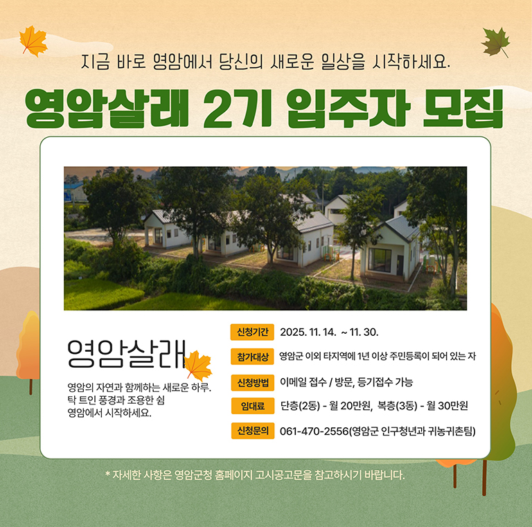 ÀÚ¼¼ÇÑ ³»¿ëÀº ¿µ¾Ï±º ȨÆäÀÌÁö °í½Ã¡¤°ø°í¶õ¿¡¼ È®ÀÎÇÒ ¼ö ÀÖ´Ù. ¹®ÀÇ´Â ¿µ¾Ï±º Àα¸Ã»³â°ú(061-470-2556)·Î ÇÏ¸é µÈ´Ù.