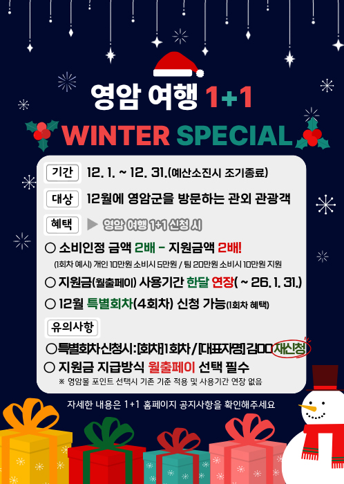 ±âÁ¸¿¡ 3ȸÂ÷±îÁö Àμ¾Æ¼ºê¸¦ ¹ÞÀº °ü±¤°´¿¡°Ô´Â ¡®12¿ù Ưº°È¸Â÷¡¯¸¦ Àû¿ëÇØ 1ȸÂ÷ ¼öÁØÀÇ ÇýÅÃÀ» Ãß°¡ Á¦°øÇÑ´Ù. 12¿ù Áö±ÞµÇ´Â ¿ùÃâÆäÀÌ À¯È¿±â°£µµ 12¿ù 26ÀÏ¿¡¼ 2026³â 1¿ù 31ÀϱîÁö ¿¬ÀåµÈ´Ù.